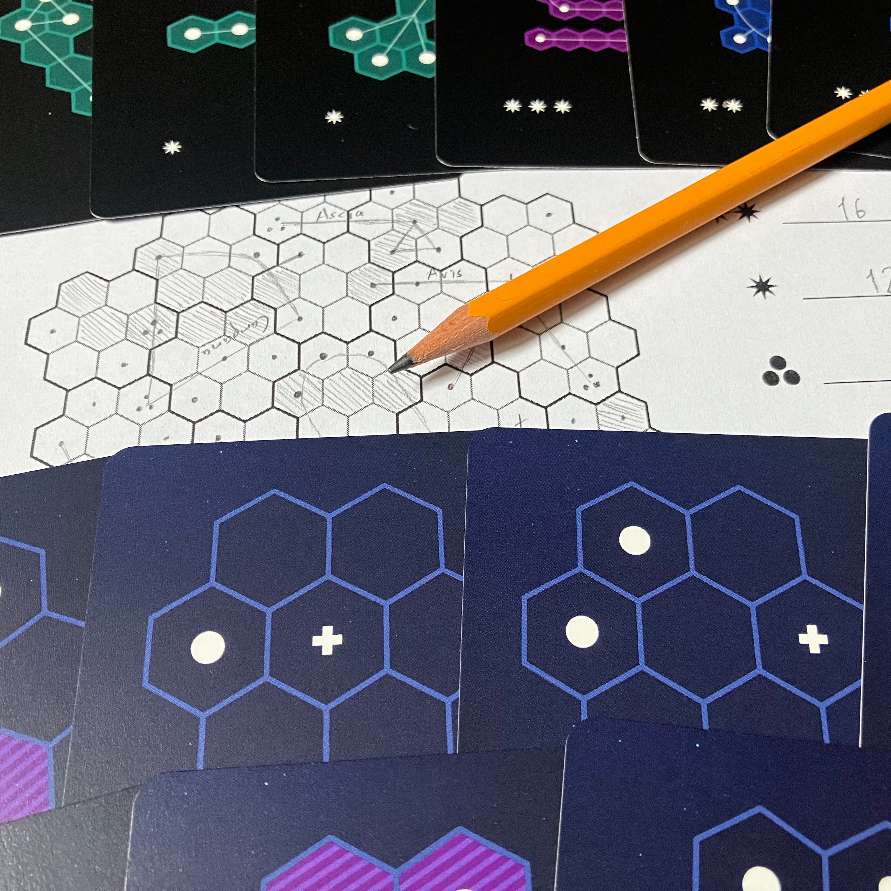 Codex Astronomica is a free print-and-play flip-and-write puzzle game where you align stars to create constellations (and other bonus scoring objectives). It's a singleplayer experience complete with a demo that lets you try the game without even having to craft the cards!