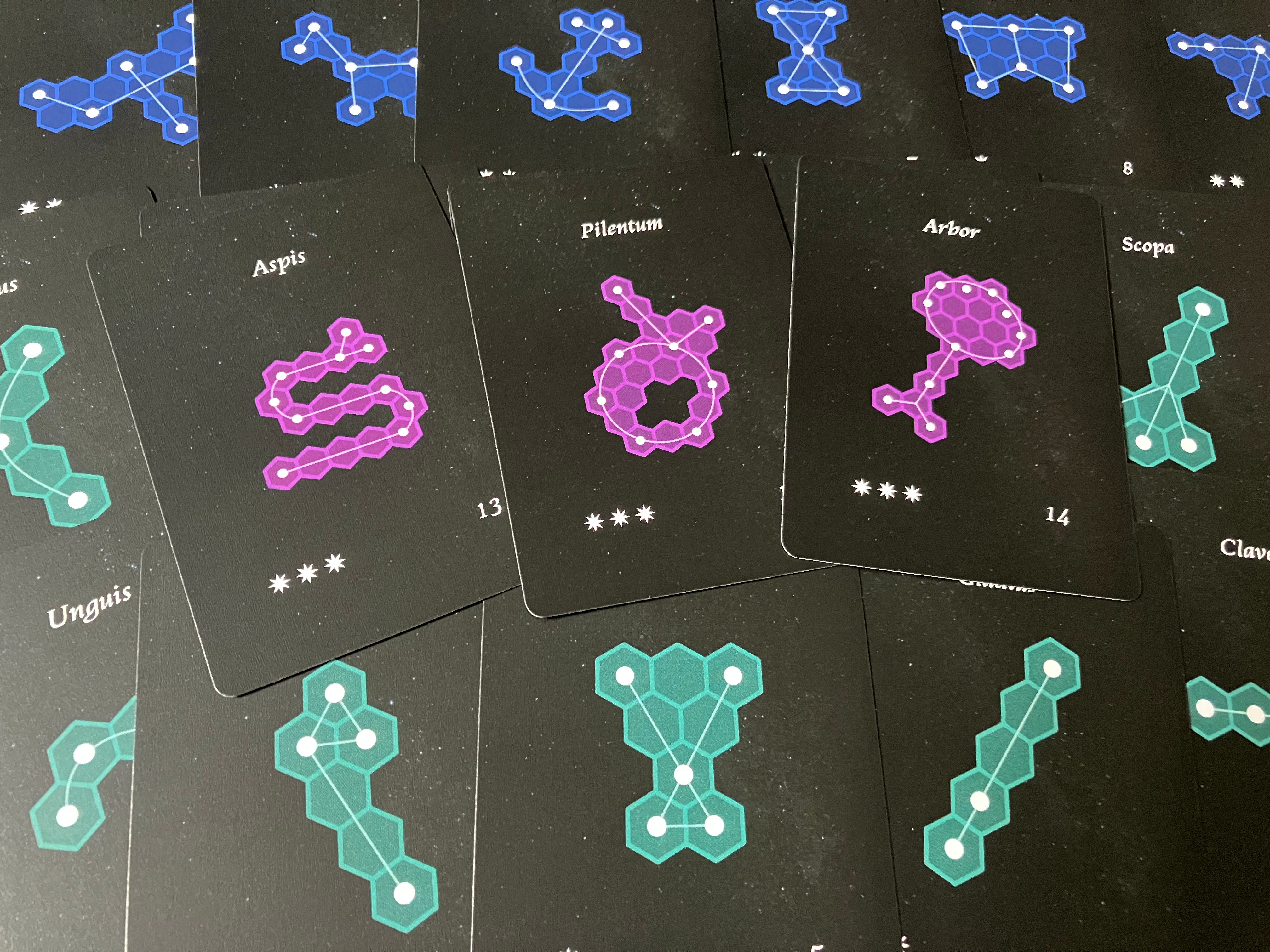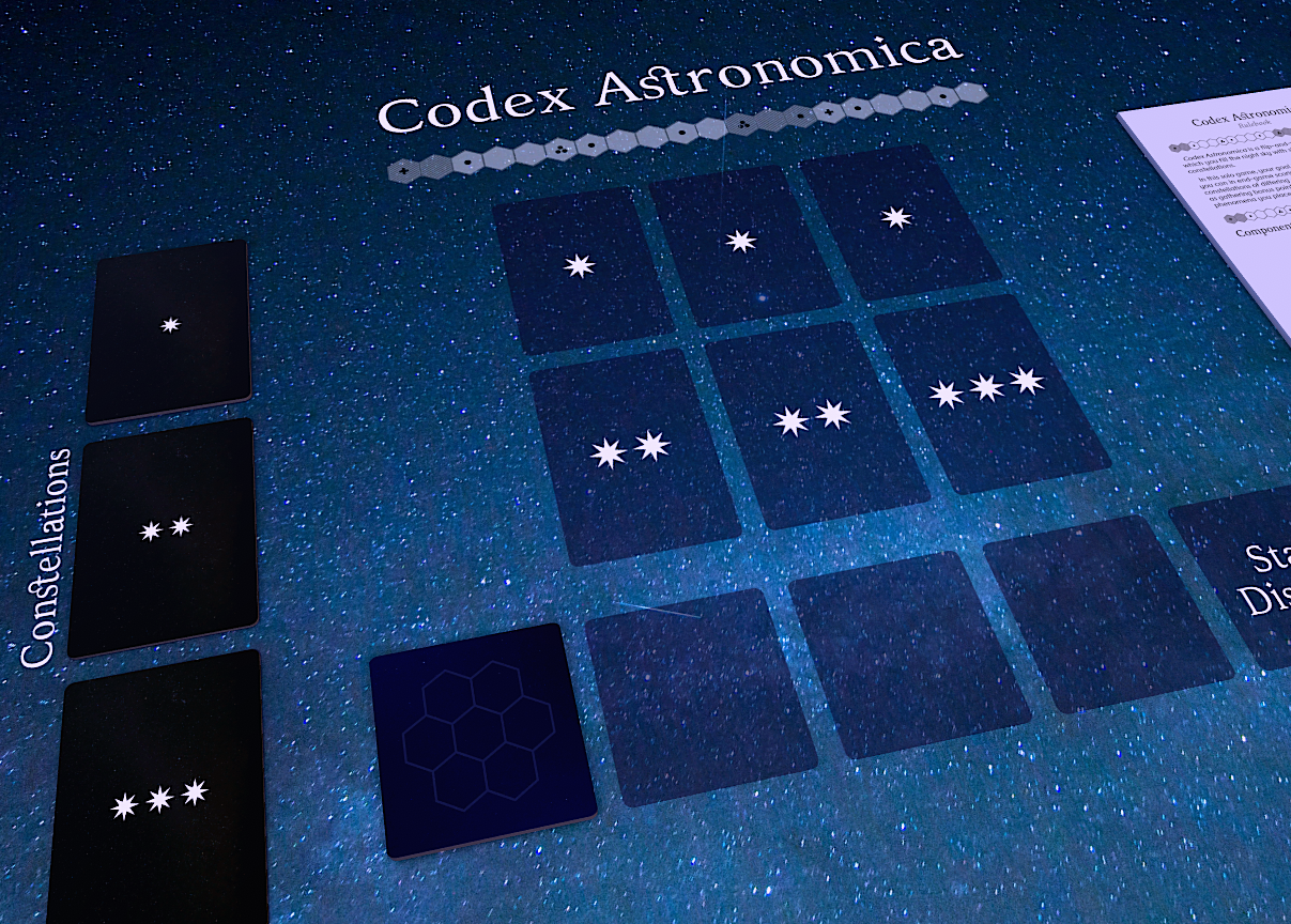 In this solo game, your goal is to gain the most points you can in end-game scoring by completing constellations of differing complexities in your sky, as well as gathering bonus points from the various types of stellar phenomena you place.