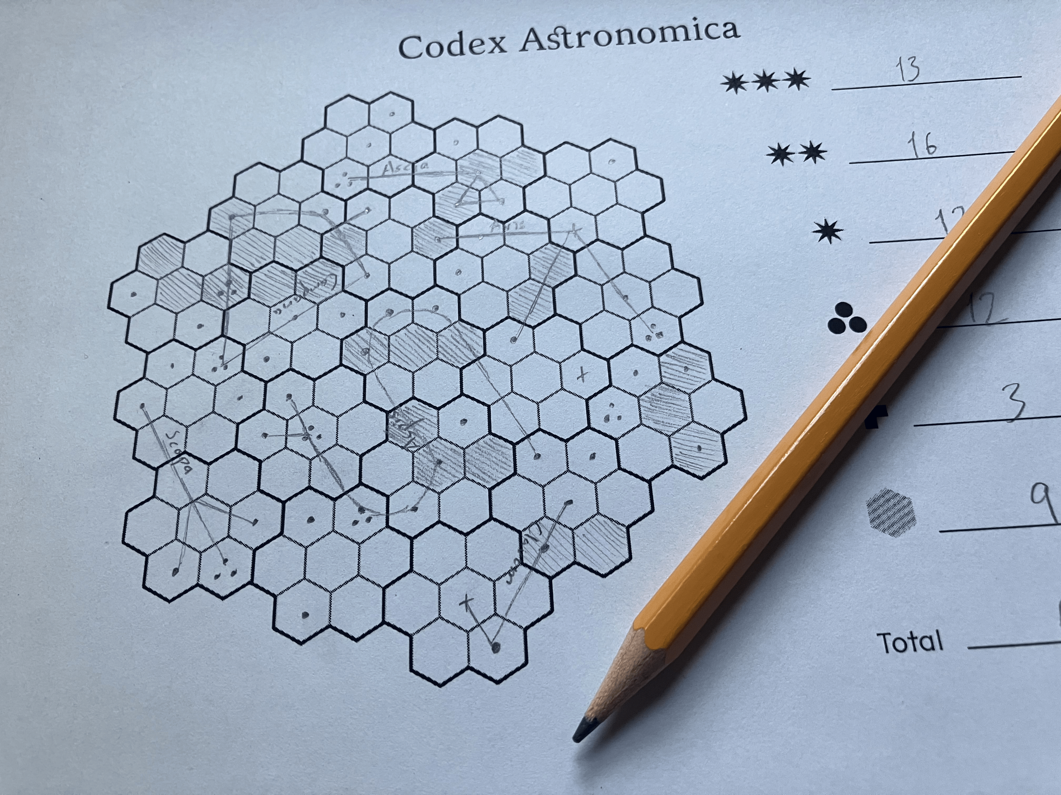 Codex Astronomica is a flip-and-write puzzle game in which you fill the night sky with stars to create constellations.
