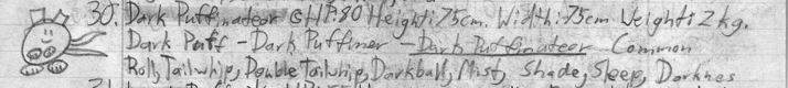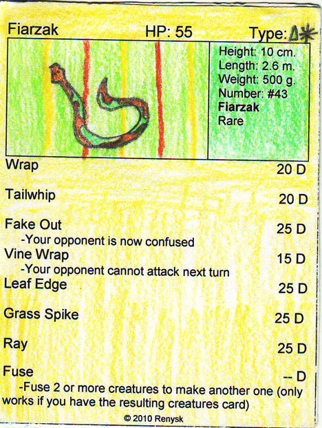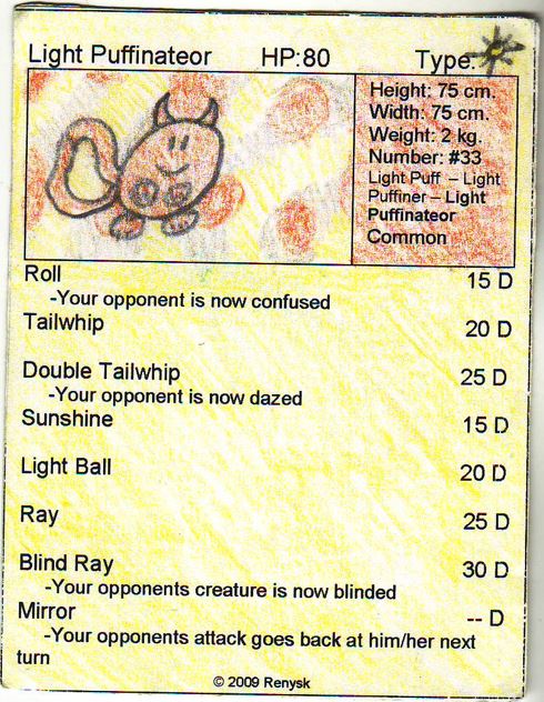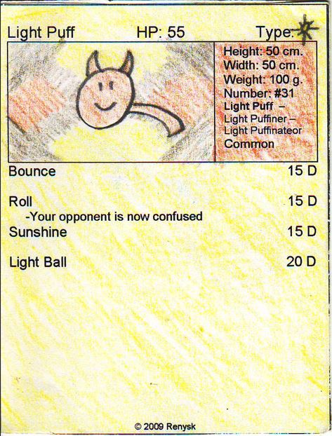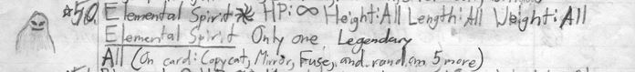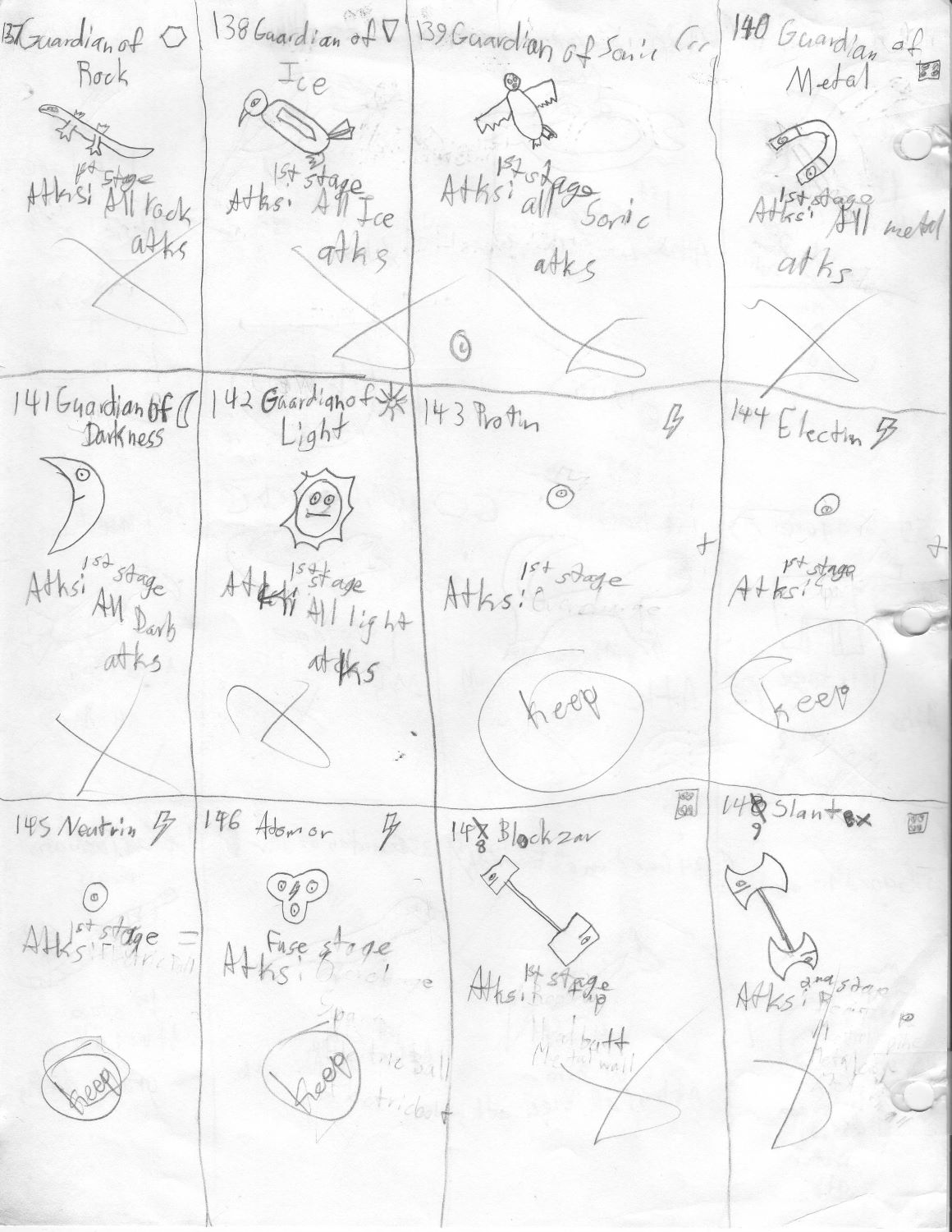 Each creature is presented with it's info-box in my notes and its card if it had one made. The creation of these cards is split over a period of 3 years as can be seen by the copyright text at the bottom. Additionally, two pages of creature concepts have been added - the first with some descriptions of the elements, and a second where the 'Guardian of Light's' expression matches my own when I look at these. Note how despite being paper copies that were never seen by anyone else, both sport copyright symbols - apparently I was also paranoid as a child.