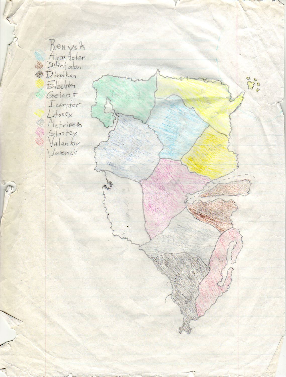 The world of Renysk (named Renysk) was based around a bunch of elements - the analogue to Pokémon's types, but also somewhat inspired by Bionicle. Each element had its own country, and 'Normal' type was omnipresent. This map was the entire extent of the worldbuilding.